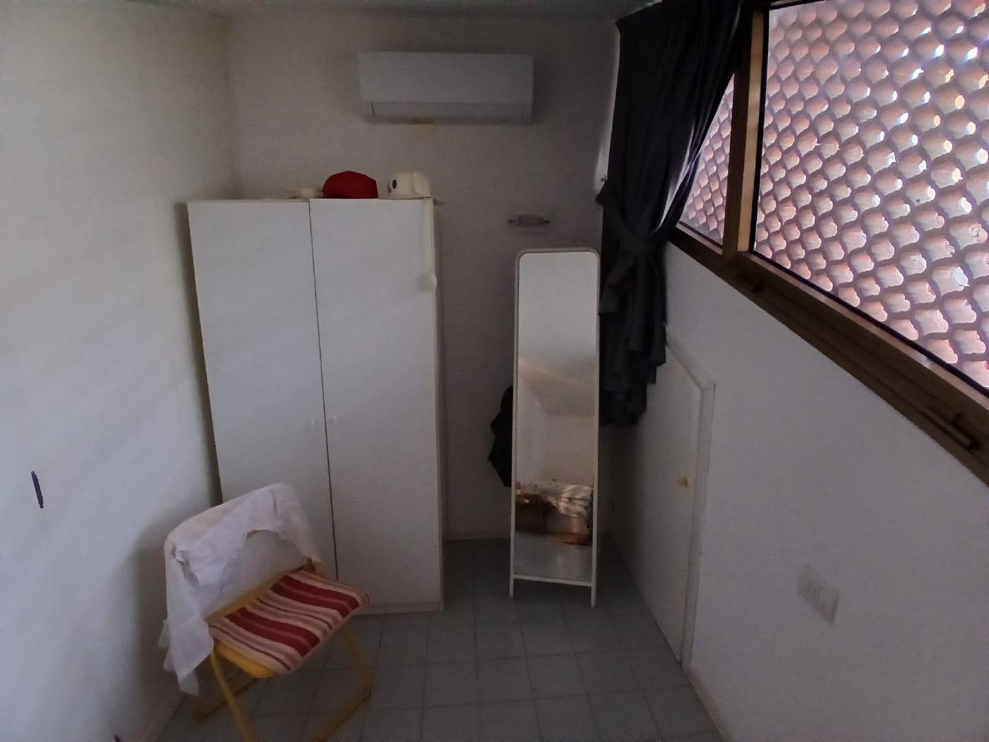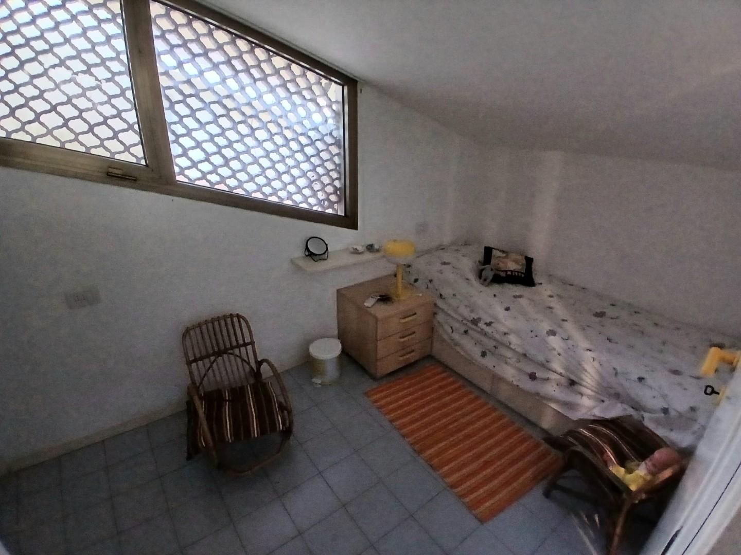 -camera singola, piccolo bagno senza doccia, ripostiglio e altro spazio con un letto singolo al piano sototetto dotato di finestre apribili e aria condizionata.