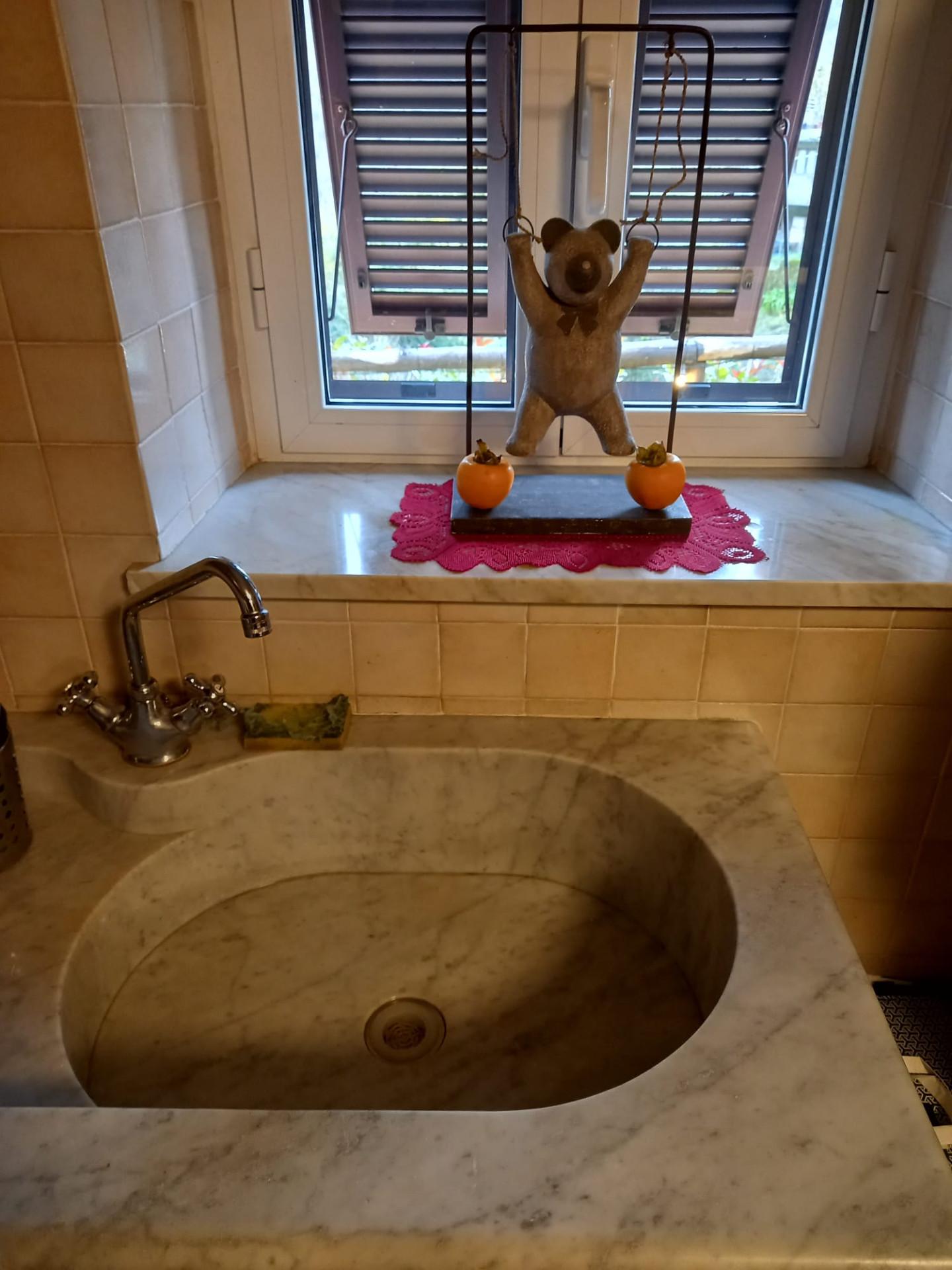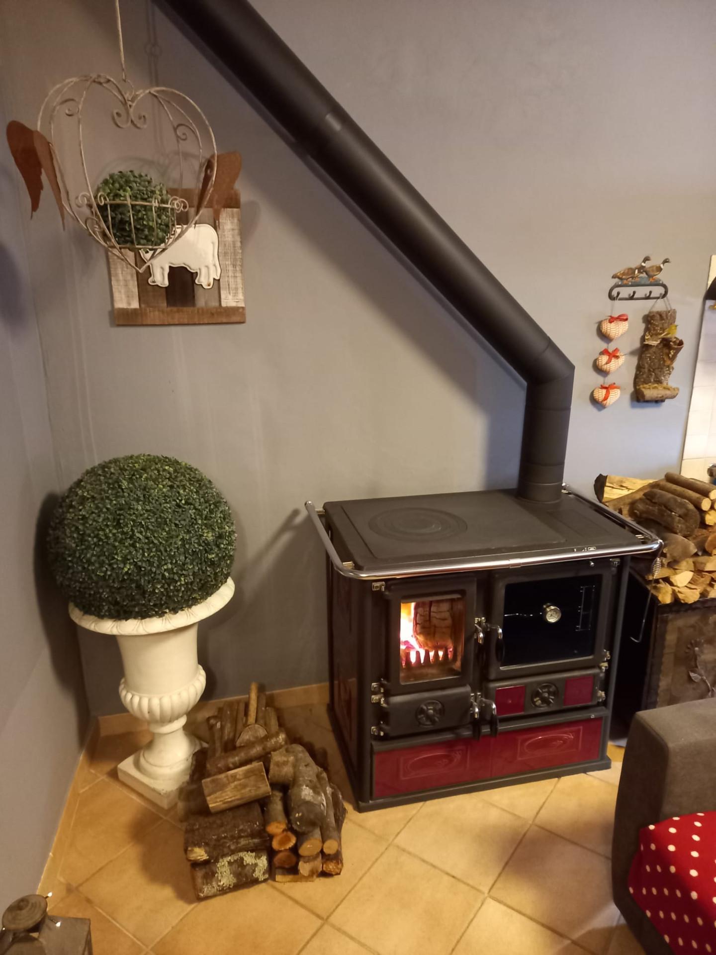 Cucina con lavello in marmo di Carrara, soggiorno con termosifoni a GPL e una splendida stufa a legna economica della Nordica con forno e piano cottura ha basso consumo energetico.