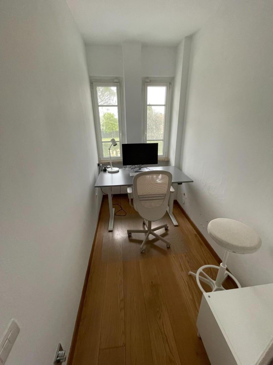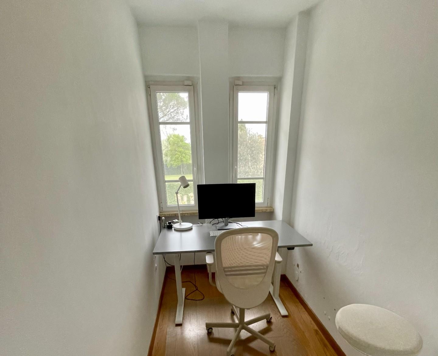 Un valore aggiunto importante è lo studio separato, già attrezzato con scrivania regolabile in altezza, schermo, tastiera e mouse, ideale per lavorare comodamente da casa. La proprietà dispone inoltre di Wi‑Fi, aria condizionata nella zona giorno e nelle camere, e 2/3 posti auto.